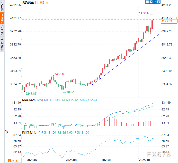 汇通财经APP讯——周二(10月14日),现货黄金自日内创下的历史新高(4179.47美元/盎司)大幅回落,现于4125美元/盎司附近震荡,接近日内波动区间下轨。美国总统特朗普在关税问题上的立场转变持续提振市场风险偏好,加之美元日内逢低买盘的出现,促使黄金在严重超买条件下出现获利了结。