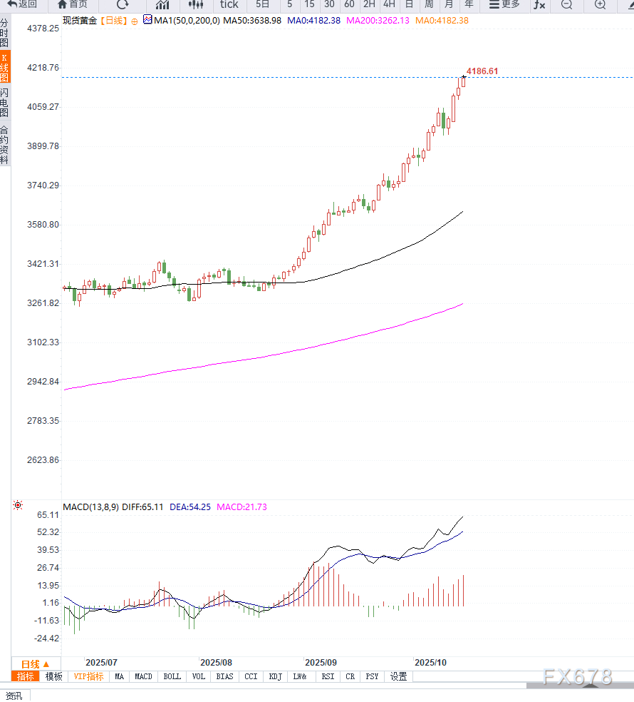 从技术面来看,黄金价格在突破前高后形成加速上行通道。当前价格运行在4120美元–4250美元区间,上方若突破4250美元,将打开进一步冲击4300美元的空间。