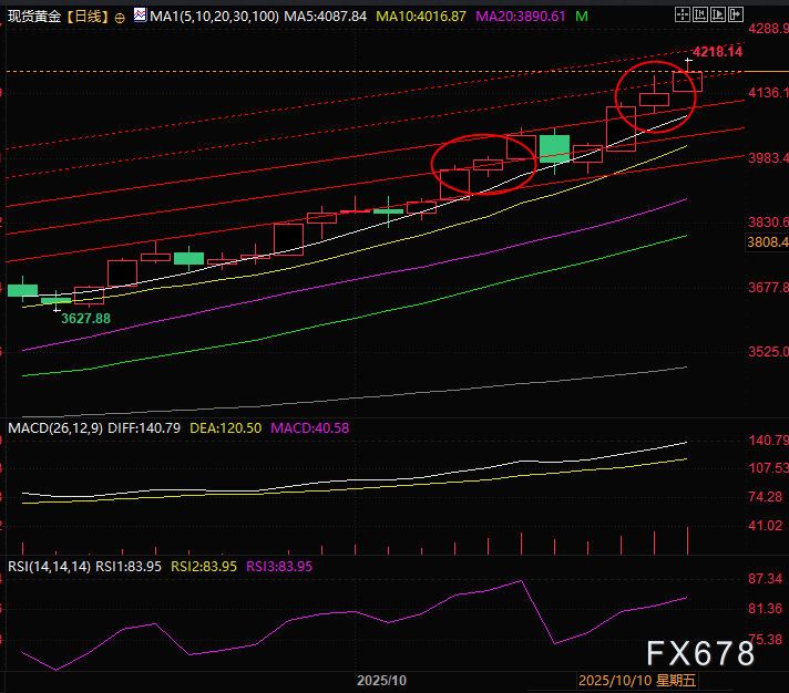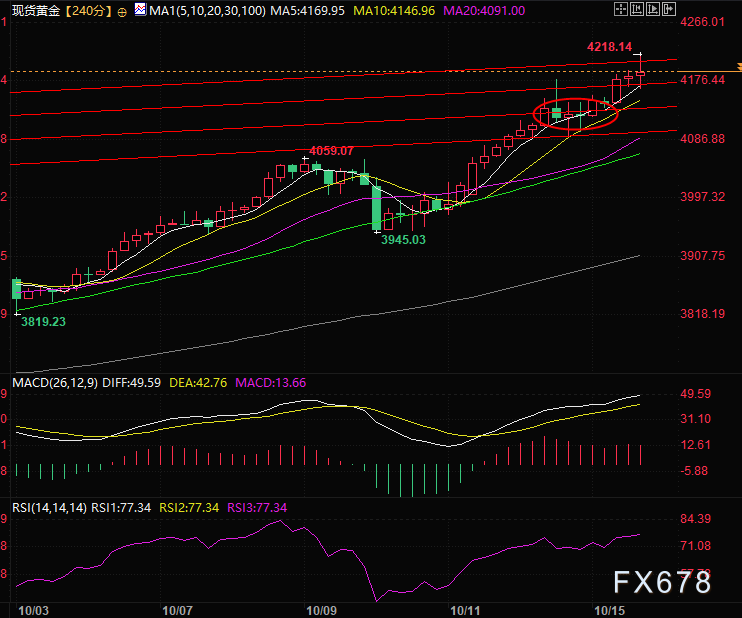 现货黄金四小时线显示金价遇到通道上轨受阻,其5日线也是通道中轨是观察重点,由于在红圈附近黄金有过整理形态正常情况应该可以继续上涨,之后加速段则是比较好的卖出点位,如果金价没有继续上涨在4200附近整理但是未跌破5日线,则有望继续冲击4300。