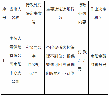 中荷人寿南阳中心支公司被罚!涉个险渠道内控管理不到位