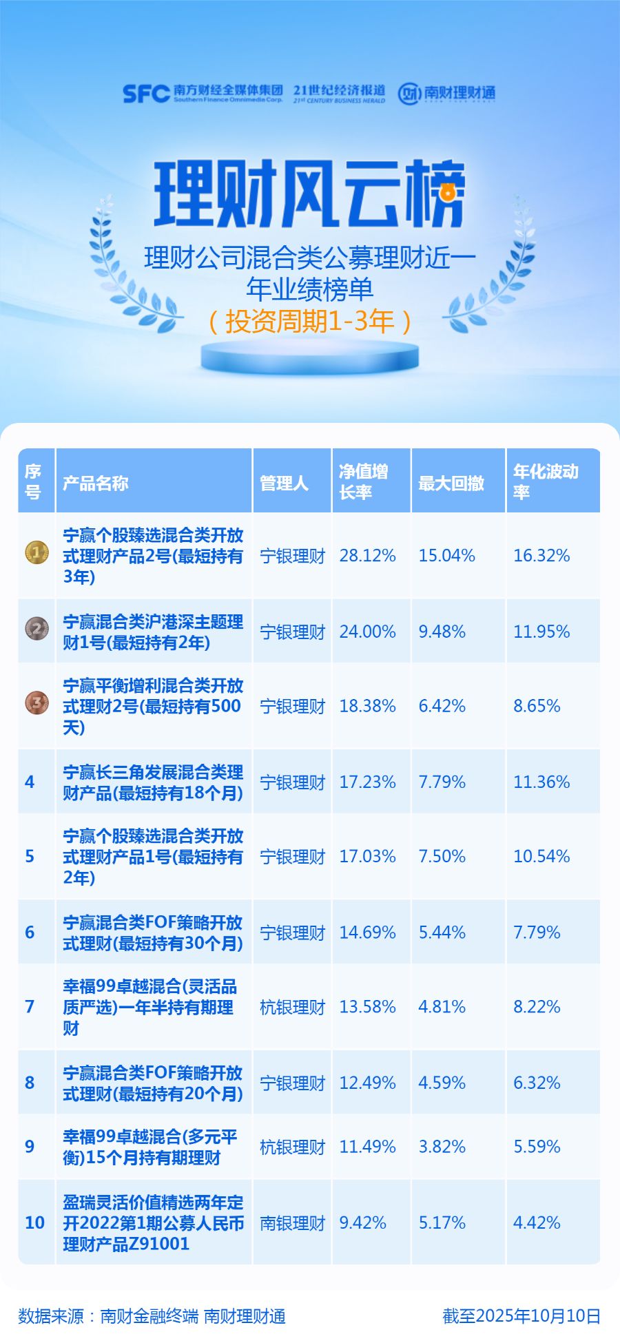 截至2025年10月10日,南财理财通数据显示,理财公司1-3年(含)期限混合类理财近一年平均净值增长率为5.9%,最大回撤均值为1.57%。从产品发行机构来看,宁银理财该期限混合类产品表现优异,近一年净值增长率均值超过15%。