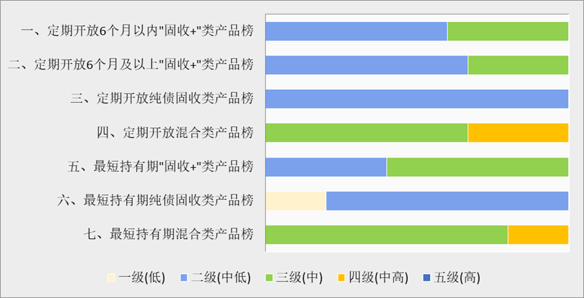 注:榜单中彩色条形长度代表数值大小,同组数值越大,条形长度越长。R-Ⅰ、R-Ⅱ、R-Ⅲ、R-Ⅳ、R-Ⅴ分别代表产品风险等级一级(低)、二级(中低)、三级(中)、四级(中高)、五级(高)。