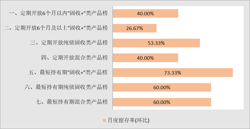 从榜单产品留存率来看,共有25家机构旗下53只产品连续上榜,产品留存率达到50.48%,各榜单产品留存率均环比上升。但定期开放“固收+”类产品的留存率依然较低,竞争较为激烈。