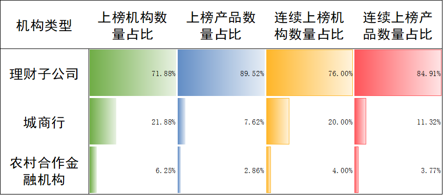 9月上榜的105只理财产品,分别来自32家机构。国有行、股份行理财子公司依然具备显著竞争优势。工银理财、信银理财、兴银理财、华夏理财、中邮理财、农银理财、建信理财、招银理财、交银理财等表现居前。
