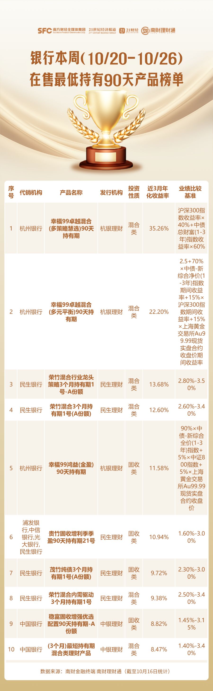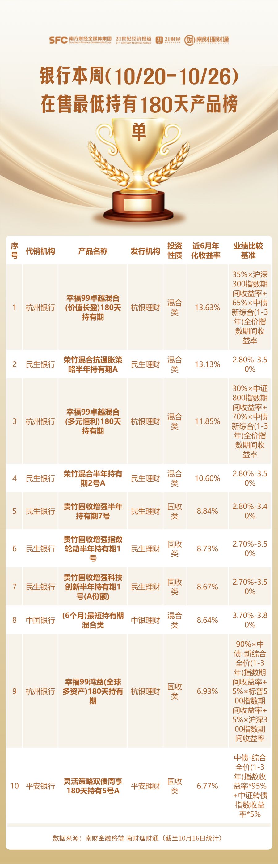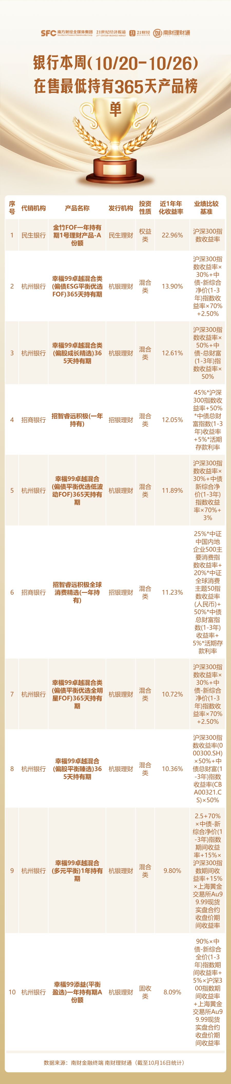 编者按:当前银行理财货架产品琳琅满目,诸如“增强”“稳健”“均衡”等名称相近、特征模糊的产品层出不穷,投资者应如何甄别与选择?为降低投资者的选择成本,南财理财通课题组从代销机构角度入手,每周一聚焦各渠道当周在售的理财产品,搜罗其中业绩表现优异者,并发布代销产品业绩榜单。