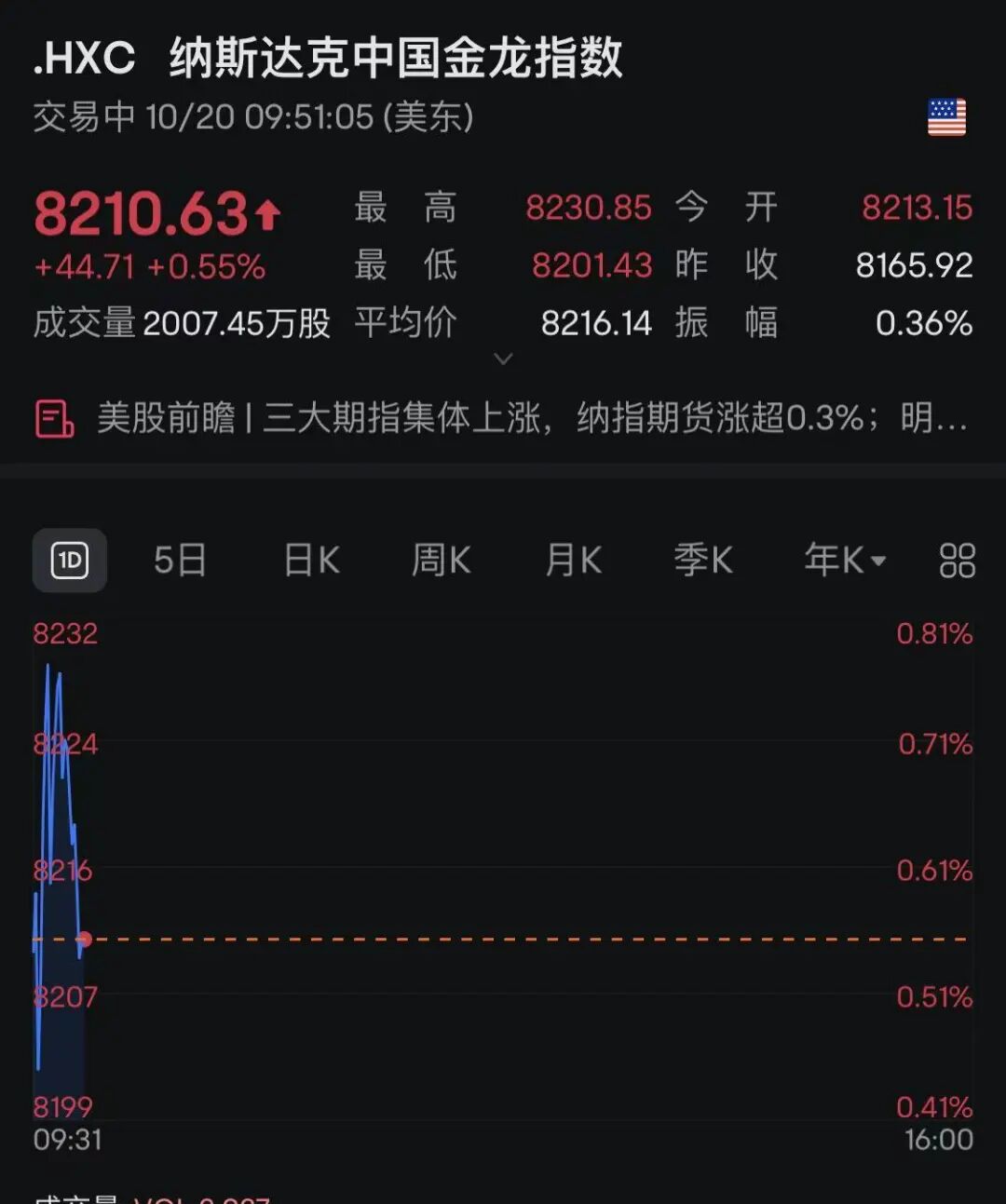 中概股也集体拉升,纳斯达克中国金龙指数走高,截至发稿涨逾0.5%,个股方面,无忧英语涨近8%,极氪涨近4%。