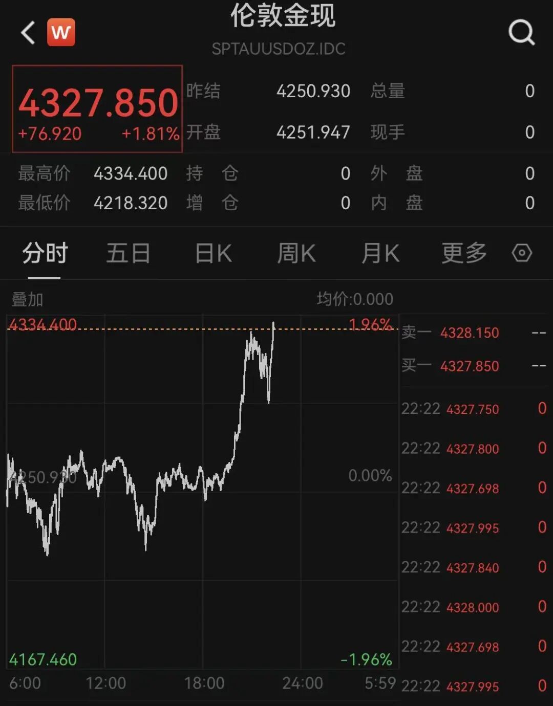 值得注意的是,现货黄金在晚间突然直线拉升,冲破4300美元,最高涨至4334美元附近,今天曾一度跌至4220美元附近。COMEX黄金更是大涨超2.7%,最高涨至4344美元附近。