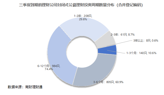 从投资周期维度观察,中短期限产品成为三季度到期主力。其中,6—12 个月期限到期产品数量最多,达984只,占比74.4%;3—6个月期限产品次之,到期数量为805只,占比 60.9%;1—2年期限到期产品有208只,占比29.6%。与之形成鲜明对比的是,3年以上长期限产品到期数量极少,仅8只,占比仅 0.6%。