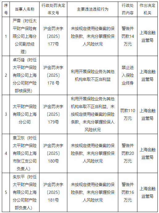 中国经济网北京11月1日讯国家金融监督管理总局上海监管局网站昨日披露的行政处罚信息公开表(沪金罚决字〔2025〕177-181号)显示,太平财产保险有限公司上海分公司存在如下主要违法违规行为:利用开展保险业务为其他机构牟取不正当利益、未按规定使用经备案的保险条款、未充分掌握投保人风险状况。上海金融监管局对其罚款110万元。3名相关责任人被警告,并被罚款共计50万元,另有1名责任人被禁止进入保险业终身。