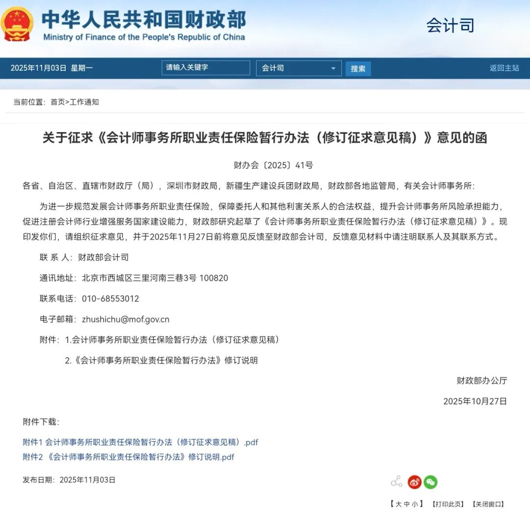 关于征求《会计师事务所职业责任保险暂行办法(修订征求意见稿)》意见的函