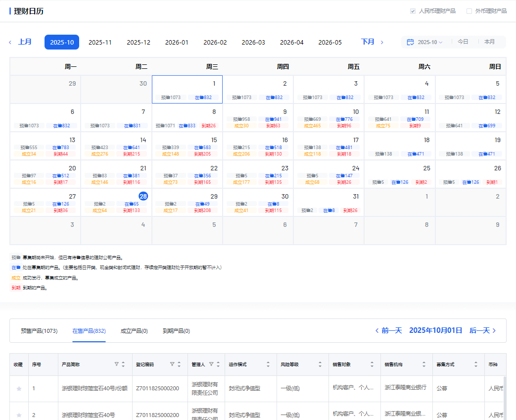 l 理财日历:以日历形式清晰展示新发、在售和到期产品,助您提前规划,妥善安排资金与投资计划。