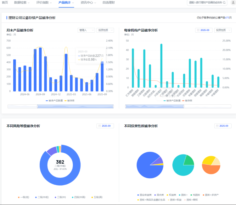 系统根据理财公司、投资性质等条件进行分析,展示对应产品的平均净值、破净数量与破净率。帮助您了解理财公司、产品的整体表现,避免因个别信息而产生不必要的焦虑。