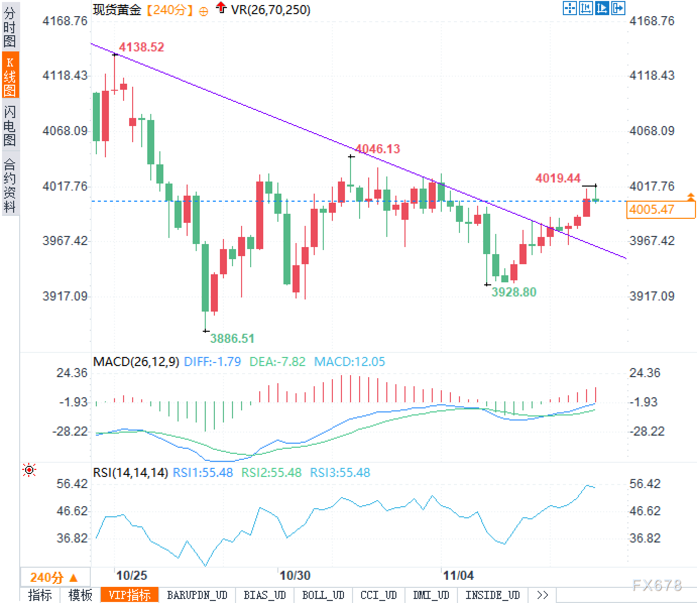 汇通财经APP讯——周四(11月6日),现货黄金北美时段于4000美元/盎司略微上方波动,四小时级别价格已重新靠近前期下行趋势线,短线反弹延续但尚未完成突破确认。