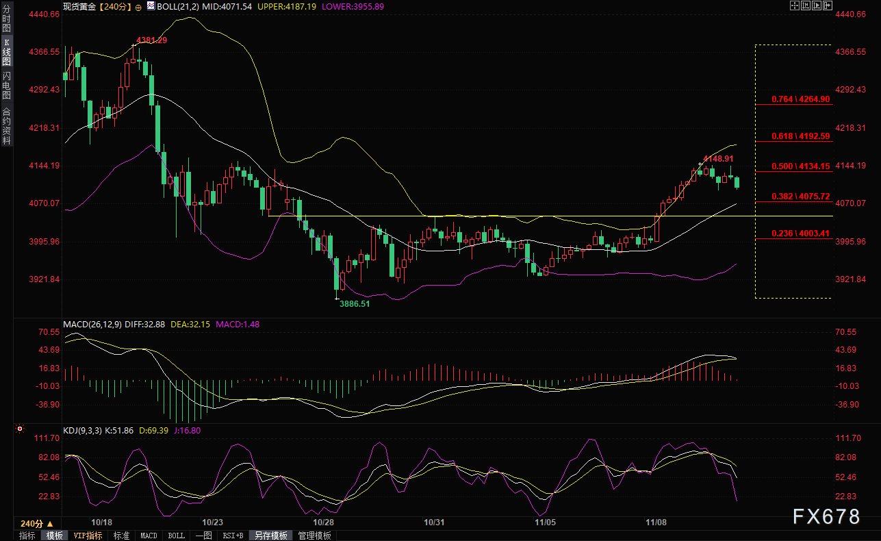 汇通财经APP讯——现货黄金在周三(11月12日)亚洲时段徘徊于三周高位下方小幅承压,目前交投于4106.24美元/盎司附近,跌幅约0.5%,多头在定位进一步升值之前等待突破4150-4155美元的水平阻力位。投资者似乎相信,延迟发布的美国宏观数据将显示经济疲软(因美国政府长期关闭),并促使美联储(Fed)在12月进一步降低借贷成本。鸽派前景使美元保持在周二触及的近两周低点附近,成为非生息黄金的关键顺风因素。