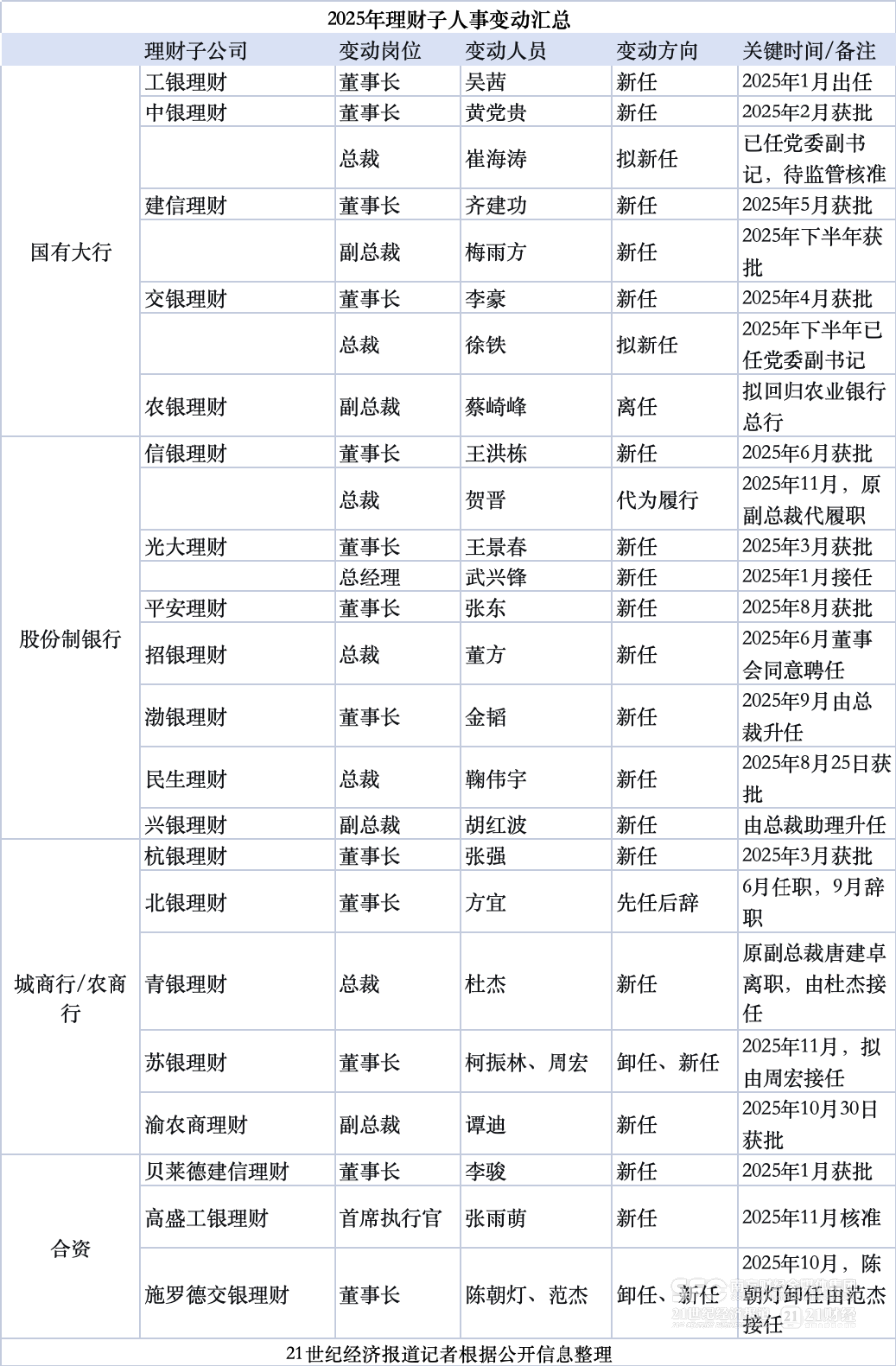 行业转型深水区内,据21世纪经济报道记者不完全统计,今年以来,31家理财子中已经有20家理财公司核心管理层更迭,高管在集团内调、跨机构流动成主线。