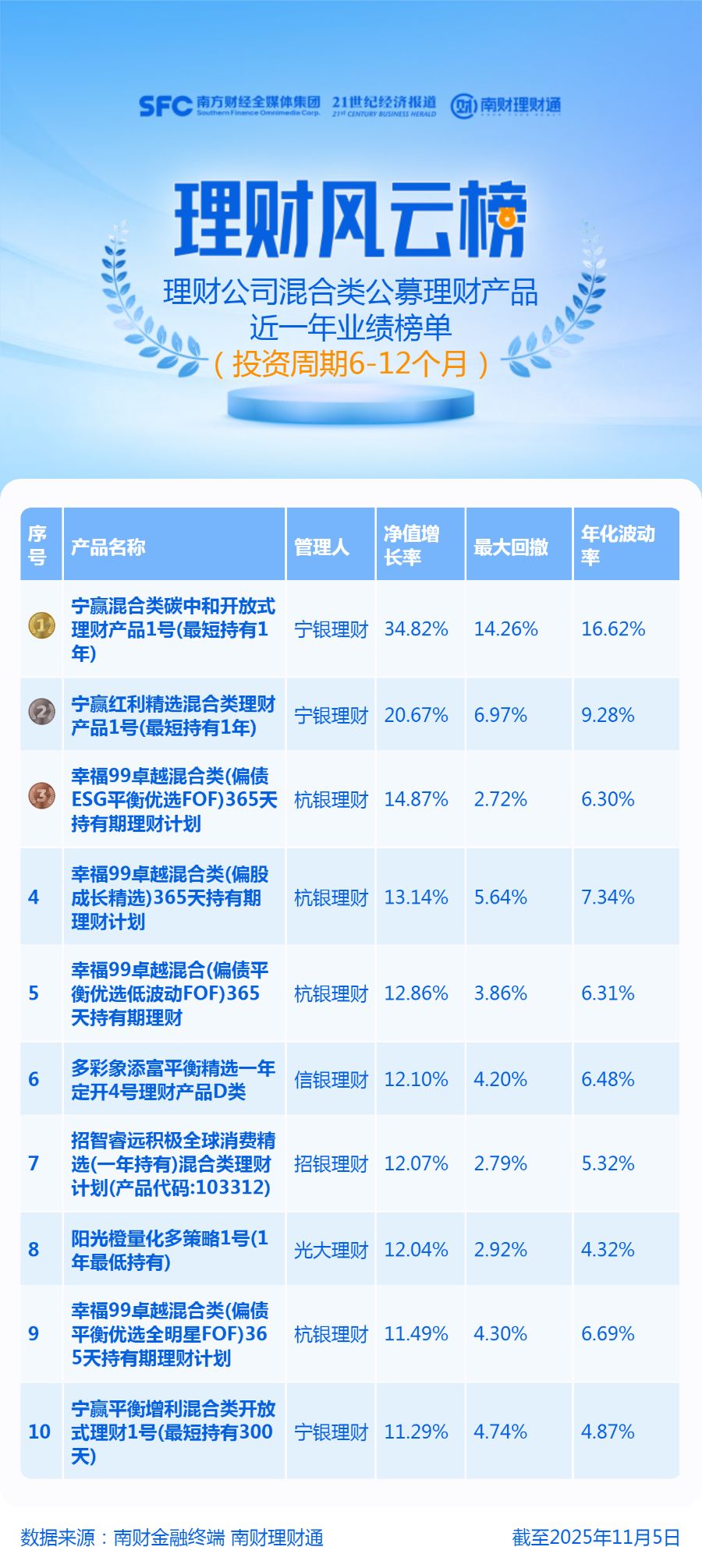 宁银理财包揽本期榜单的冠亚军。宁银理财“宁赢混合类碳中和开放式理财产品1号(最短持有1年)”和“宁赢红利精选混合类理财产品1号(最短持有1年)”依次位列榜单第一和第二,产品近一年净值增长率分别是34.82%和20.67%。杭银理财“幸福99卓越混合类(偏债ESG平衡优选FOF)365天持有期理财计划”以14.87%的近一年净值增长率位列第三。