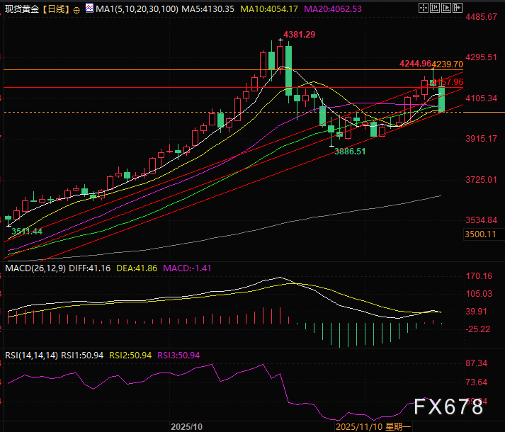 汇通财经APP讯——周五(11月14日)亚欧时段,黄金近期从三周高位开始回调,市场今天出现了奇怪的现象,美元指数和黄金一起下跌。现货黄金周五震荡走低,多头未能守住早盘上行动能,多空博弈加剧、情绪呈现明显分化。截至发稿,现货黄金交投于4053美元/盎司附近,较周四触及的三周高点4245美元显著回落。