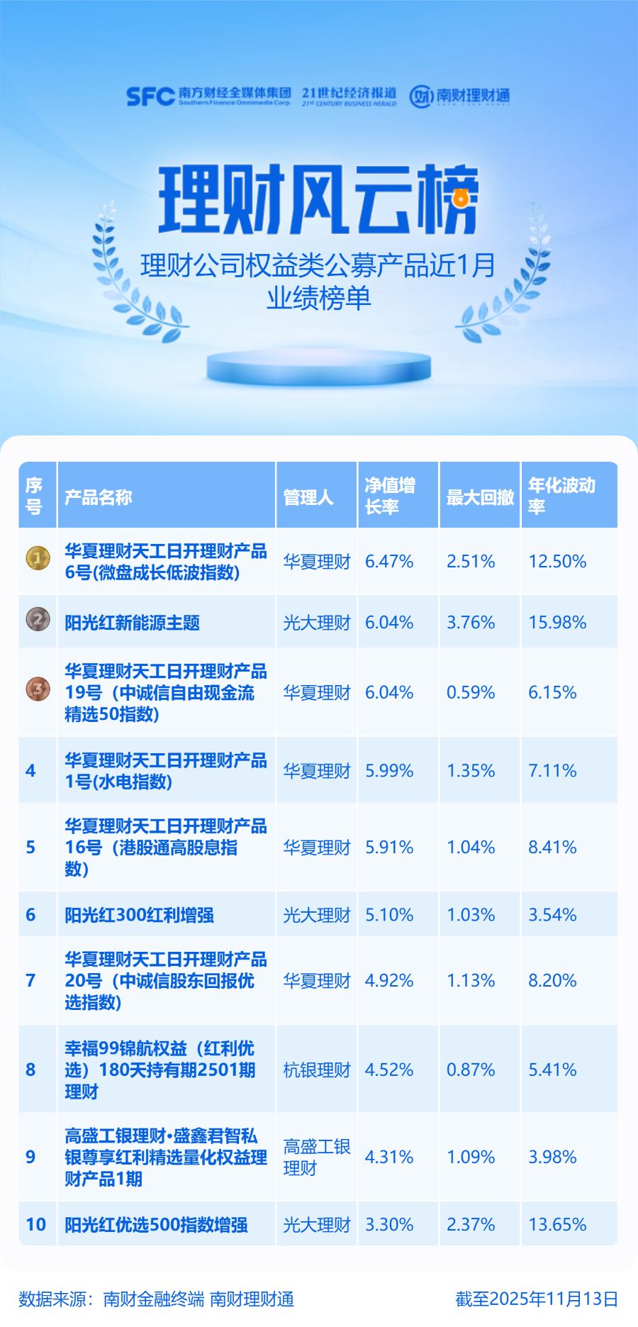 产品统计范围为理财公司权益类理财公募产品,统计截止日期为2025年11月13日,统计区间为近1个月。
