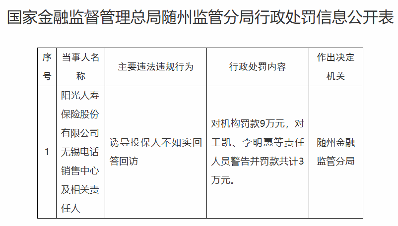 【大河财立方消息】11月22日消息,国家金融监督管理总局随州监管分局日前披露的行政处罚信息公开表显示,因诱导投保人不如实回答回访,阳光人寿保险股份有限公司无锡电话销售中心被罚9万元。
