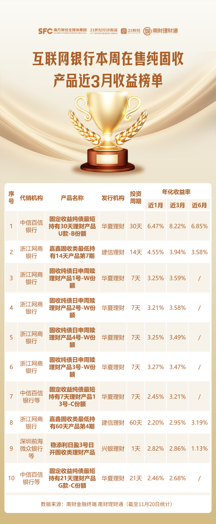 本周在售纯固收理财榜单:互联网银行代销产品收益相对偏低