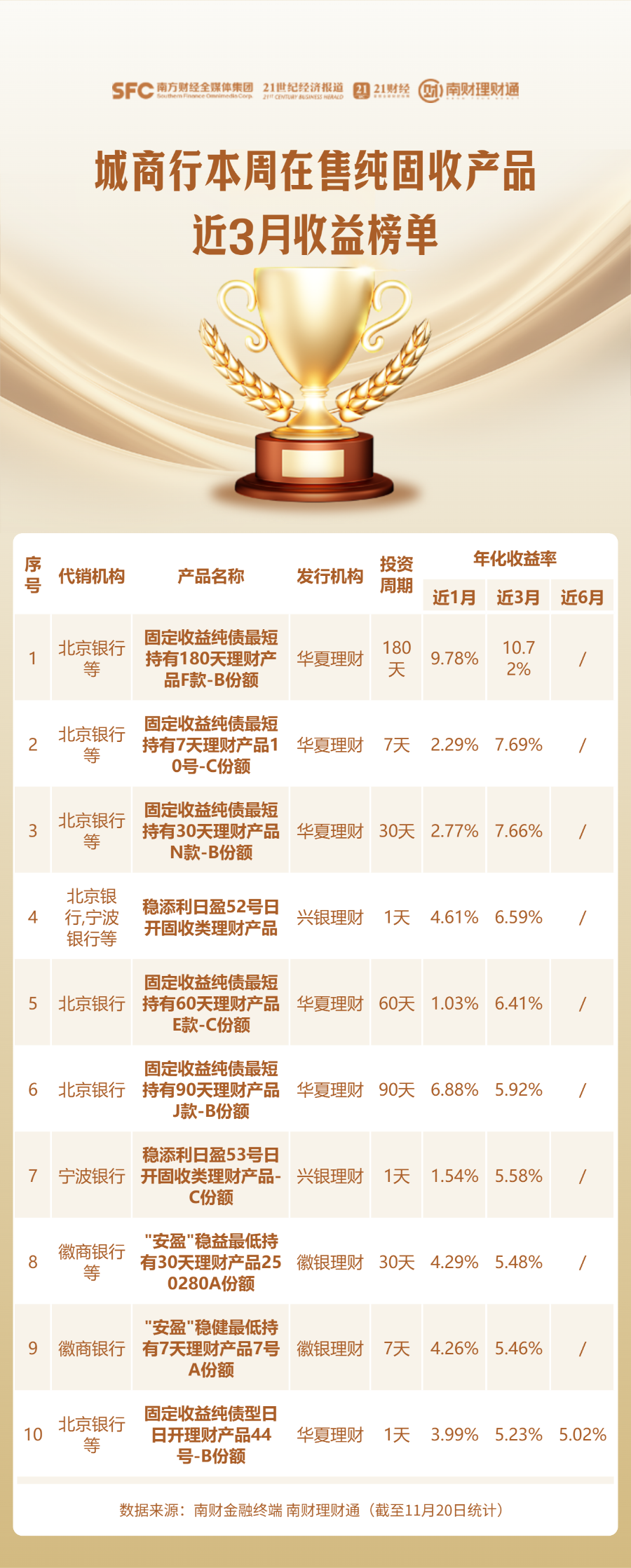 编者按:当前银行理财货架产品琳琅满目,诸如“增强”“稳健”“均衡”等名称相近、特征模糊的产品层出不穷,投资者应如何甄别与选择?为降低投资者的选择成本,南财理财通课题组从代销机构角度入手,每周一聚焦各渠道当周在售的理财产品,搜罗其中业绩表现优异者,并发布代销产品业绩榜单。