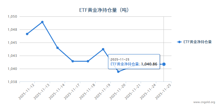 全球最大黄金ETF--SPDR Gold Trust持仓报告显示,11月25日黄金etf持有量为1040.86吨,与上一交易日持平。周二(11月25日)截止收盘,现货黄金报4129.78美元/盎司,跌幅0.12%,日内最高上探至4159.09美元/盎司,最低触4109.09美元/盎司。