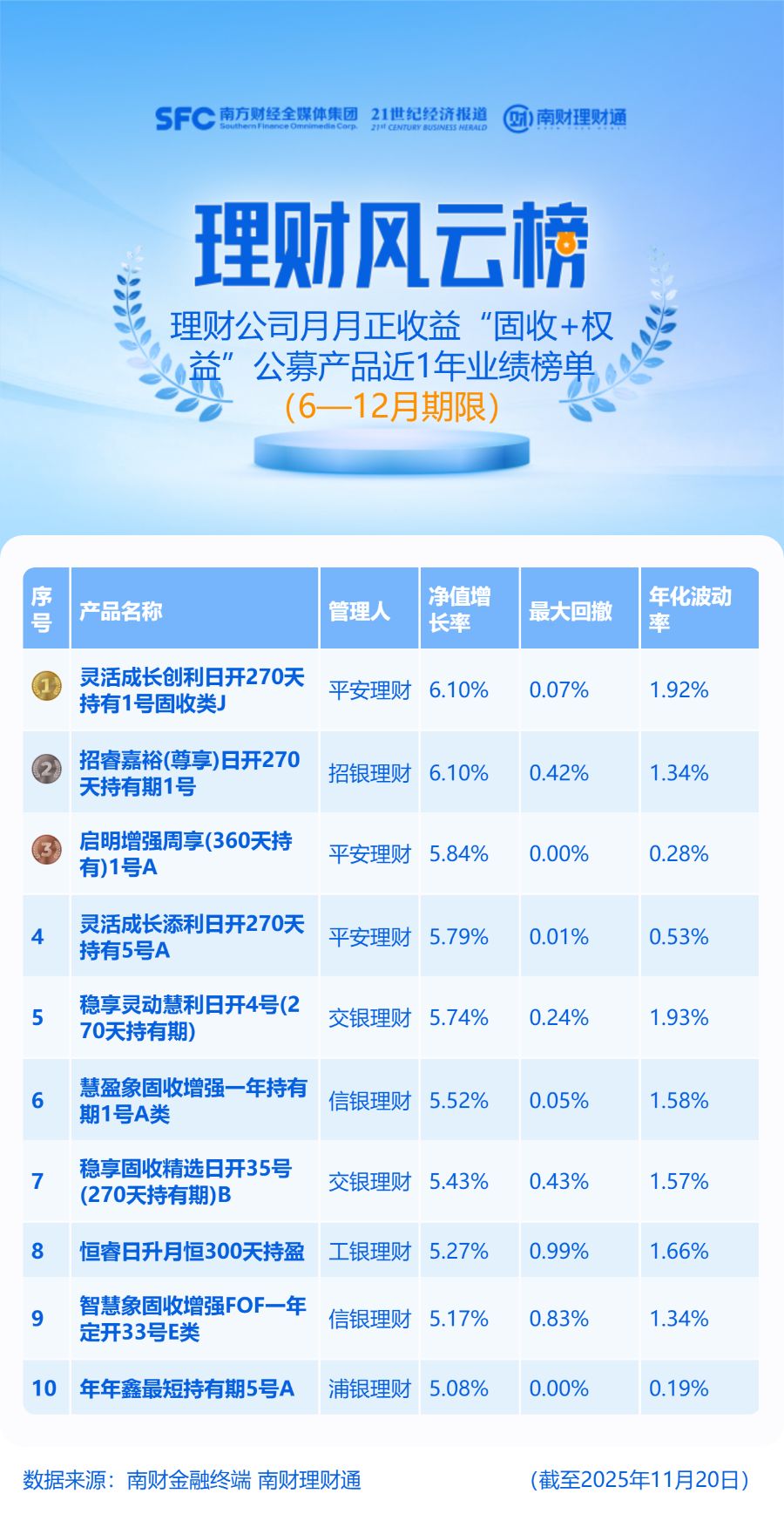 榜单数据说明:统计对象为理财公司发行的6—12月(含)的公募“固收+权益”产品,同系列同投资周期产品保留一只,统计区间为近1年,截至时间为2025年11月20日。榜单排名由理财通AI全自动化实时排名,如您对数据有疑问,请在文末联系助理进一步核实。