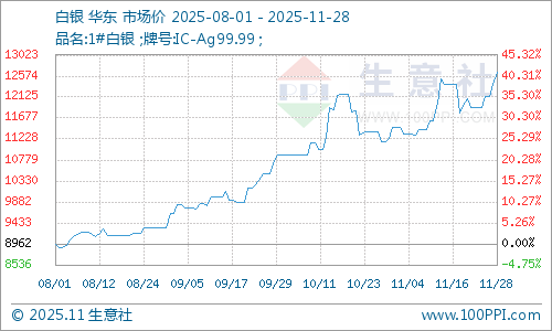 据生意社商品行情分析系统,2025年11月28日白银市场均价12649.33元/千克,较本月初(11月1日)白银市场均价11476元/千克,上涨10.22%。