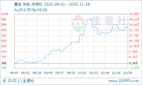 据生意社商品行情分析系统,截止2025年11月28日黄金现货早盘市场价格948.59元/克,较本月初(11月1日)黄金现货市场价格918.62元/克,上涨3.26%。