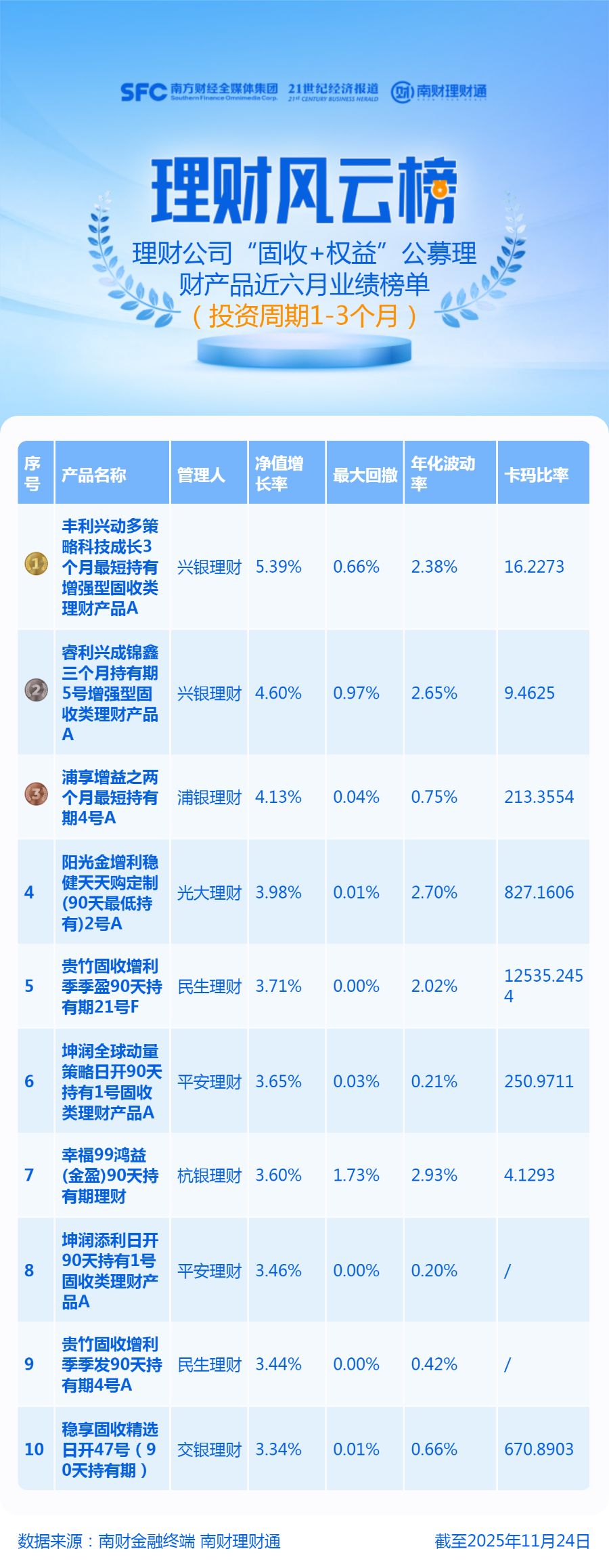 榜单数据说明:统计对象为理财公司发行的1-3个月(含)投资周期的公募混合类产品,同系列同投资周期产品保留一只,统计区间为近6月,截至时间为2025年11月24日。理财产品数据来源于南财理财通(https://newgym.sfccn.com/),股票数据来源于Wind。榜单排名由理财通AI全自动化实时排名,如您对数据有疑问,请在文末联系助理进一步核实。