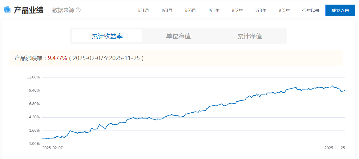 具体到业绩表现来看,产品自成立以来沿“慢牛”轨道拾级而上,二季度净值抬升3.101%,三季度再涨4.337%,截至2025年11月24日,产品成立以来年化收益率达到9.335%,近六月最大回撤仅0.66%。