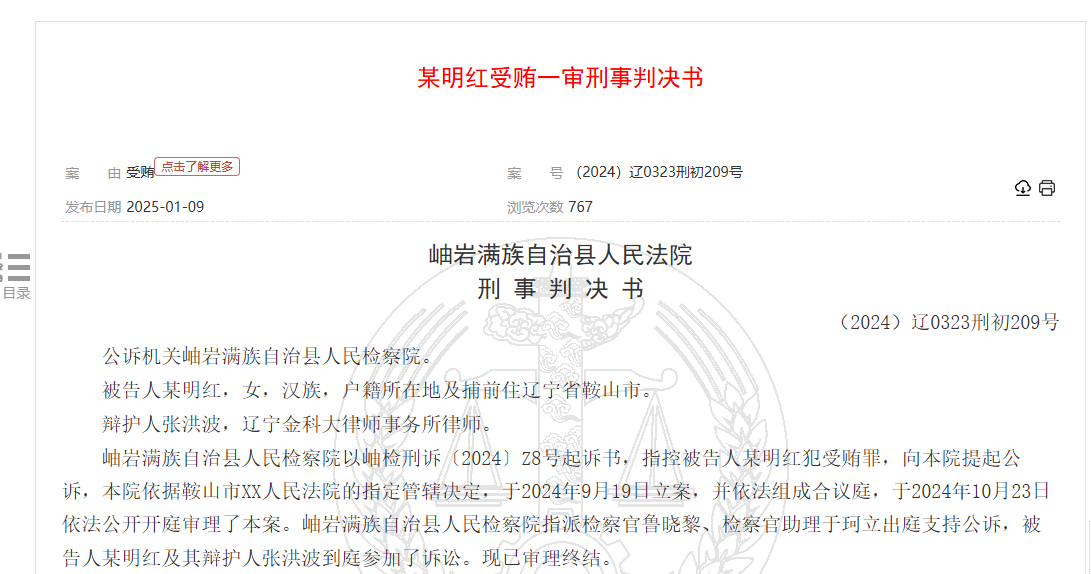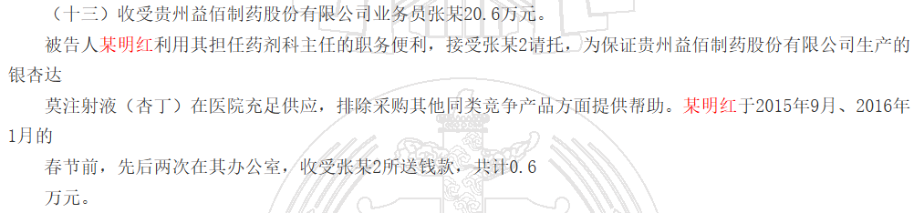 记者检索中国裁判文书网发现,此摘录文章源自《某明红受贿一审刑事判决书》。此判决书显示,贵州益佰制药(600594)股份有限公司业务员涉其中。