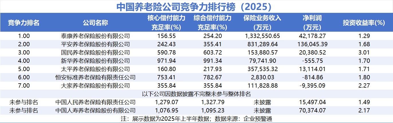 国民养老位列第三。2025 年上半年,国民养老核心偿付能力充足率为 590.78%,综合偿付能力充足率为 603.72%,保险业务收入15.39 亿元,净利润 2.04 亿元,投资收益率 3.01%,其投资能力表现突出,投资收益率居行业首位。