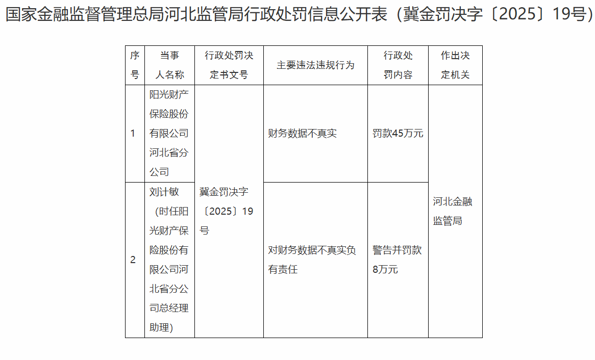 阳光财险河北省分公司被罚45万元,责任人被罚8万元