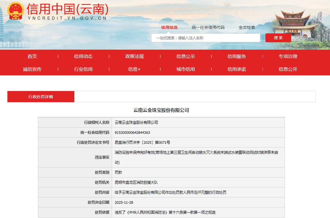 齐鲁晚报·齐鲁壹点记者于信用中国(云南)行政处罚栏获悉,11月28日,云南黄金集团旗下的云南云金珠宝股份有限公司(下称“云金珠宝”)收到罚单,其处罚类别为罚款,处罚机关为昆明市盘龙区消防救援大队。