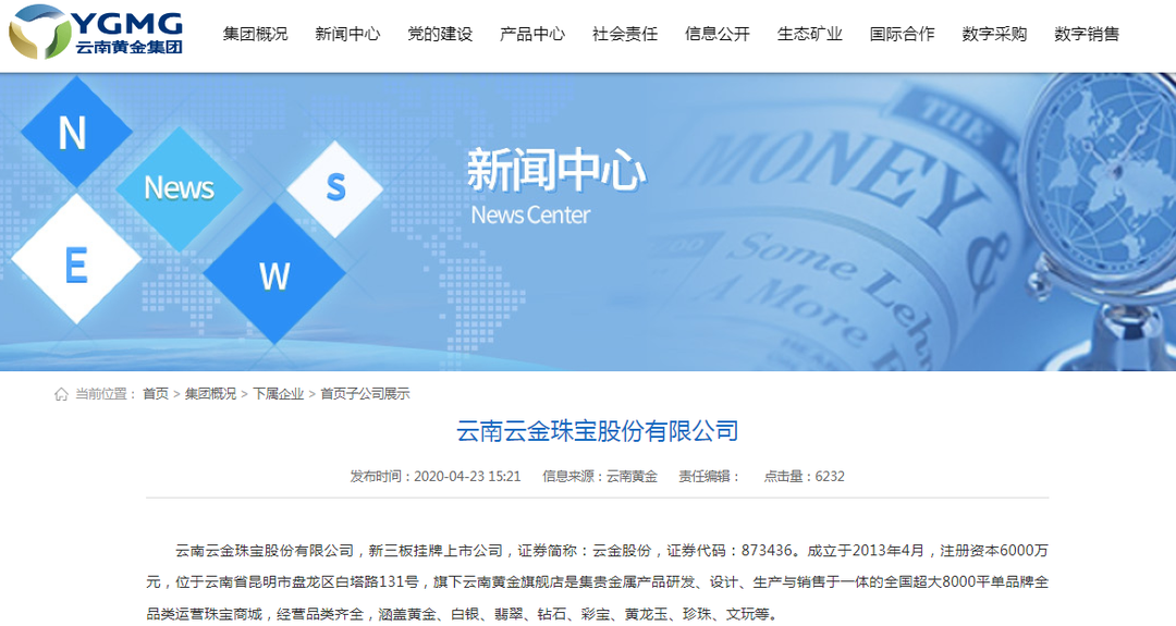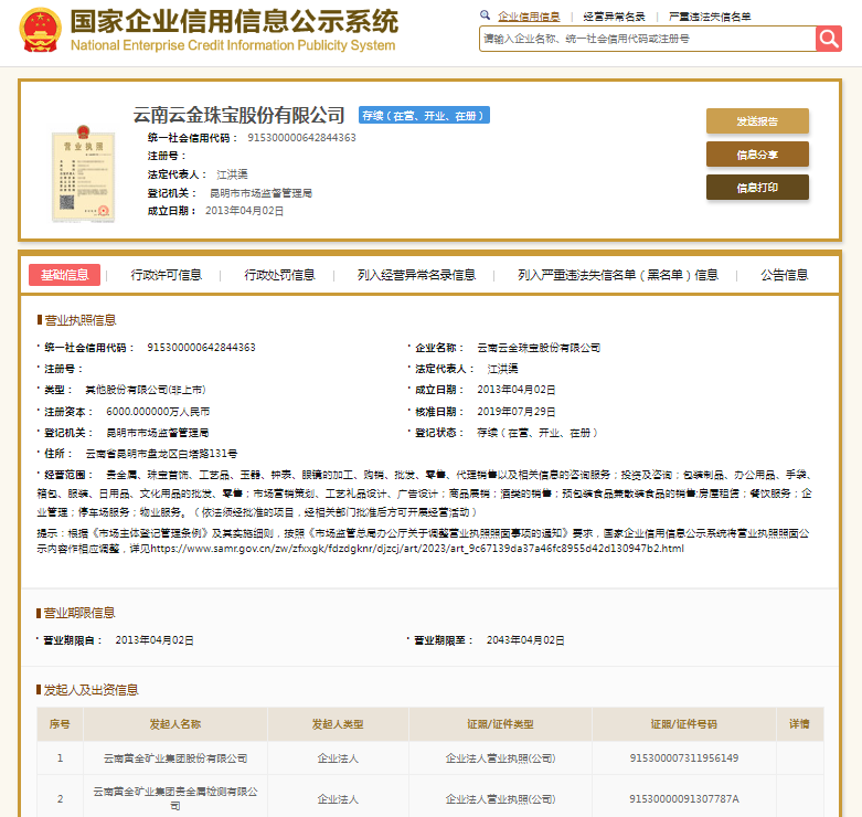 国家企业信用信息公示系统显示,云南云金珠宝股份有限公司成立于2013年,注册资本6000万元人民币,法定代表人江洪渠,大股东为云南黄金矿业集团股份有限公司。