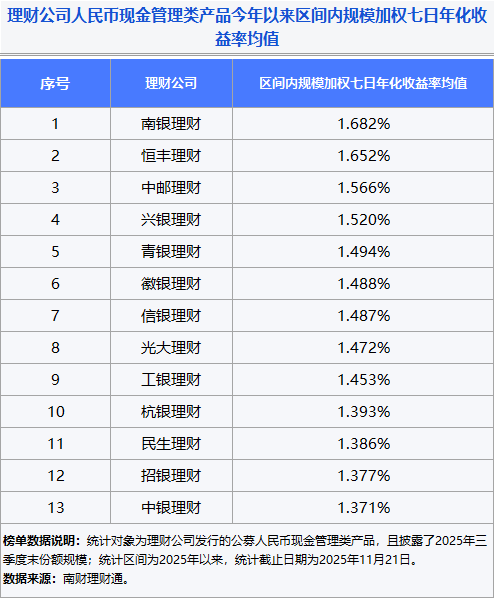 南财理财通数据显示,截至2025年11月21日,理财公司共存续2381只人民币现金管理类产品(各份额分开统计),今年以来全量产品规模加权七日年化收益率均值为1.424%。分机构来看,4家理财公司现金管理类产品今年以来规模加权七日年化收益率均值超1.5%,亦有4家机构规模加权七日年化收益率均值低于1.4%,业绩表现有所分化。其中,南银理财拔得头筹,现金管理类产品今年以来平均七日年化收益率达1.682%,实现收益领跑。