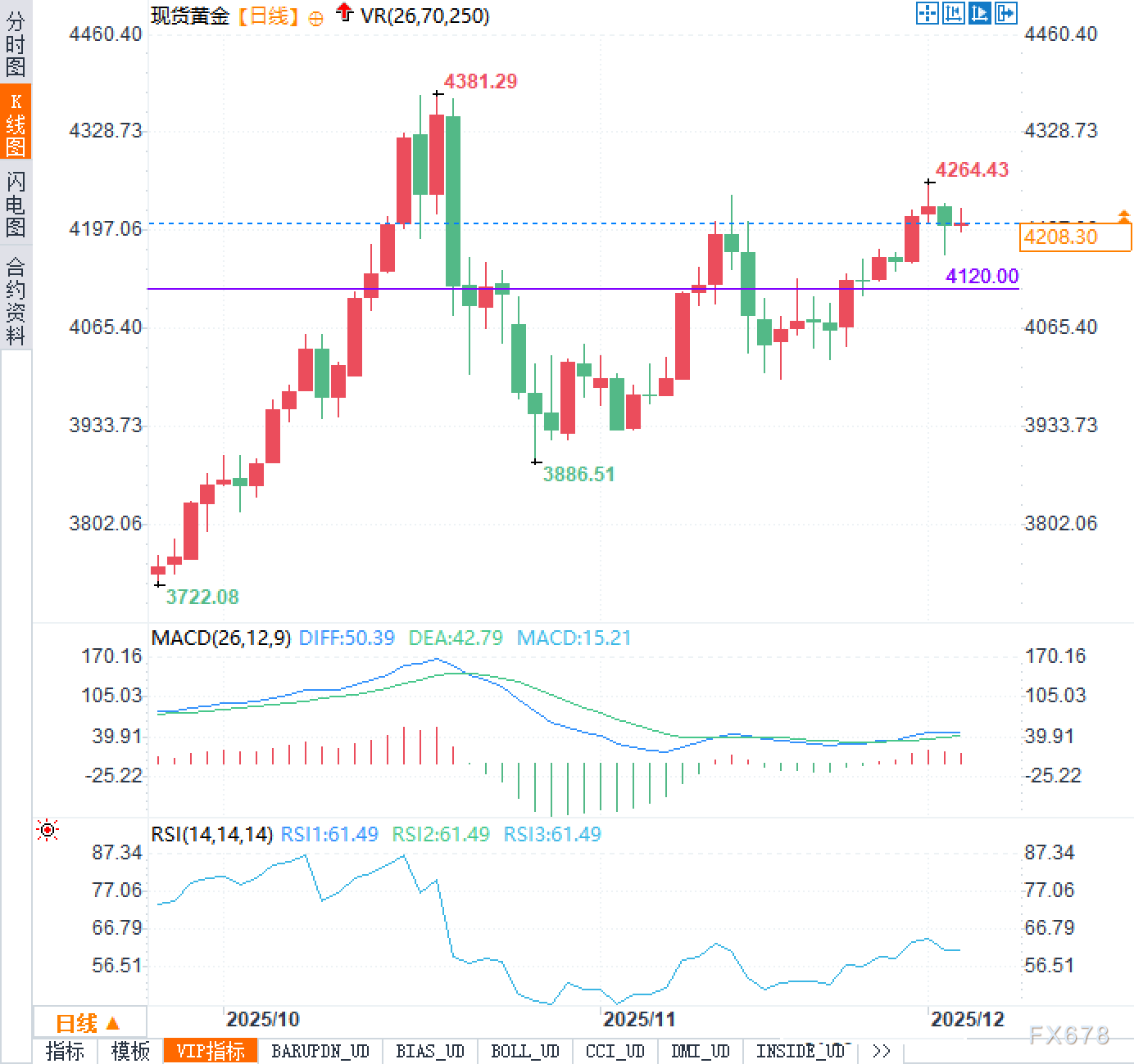 从图中的K线形态来看,黄金价格近期经过一波上涨后,已经触及到4264.43美元的高点,并出现了一定程度的回落。目前价格处于4200美元附近,接近重要的支撑位。