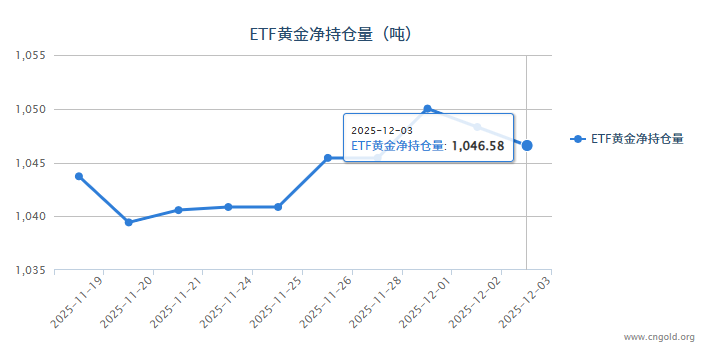 全球最大黄金ETF--SPDR Gold Trust持仓报告显示,12月3日黄金etf持有量为1046.58吨,较上一交易日减少1.72吨。周三(12月3日)截止收盘,现货黄金报4202.69美元/盎司,跌幅0.06%,日内最高上探至4241.17美元/盎司,最低触4193.99美元/盎司。