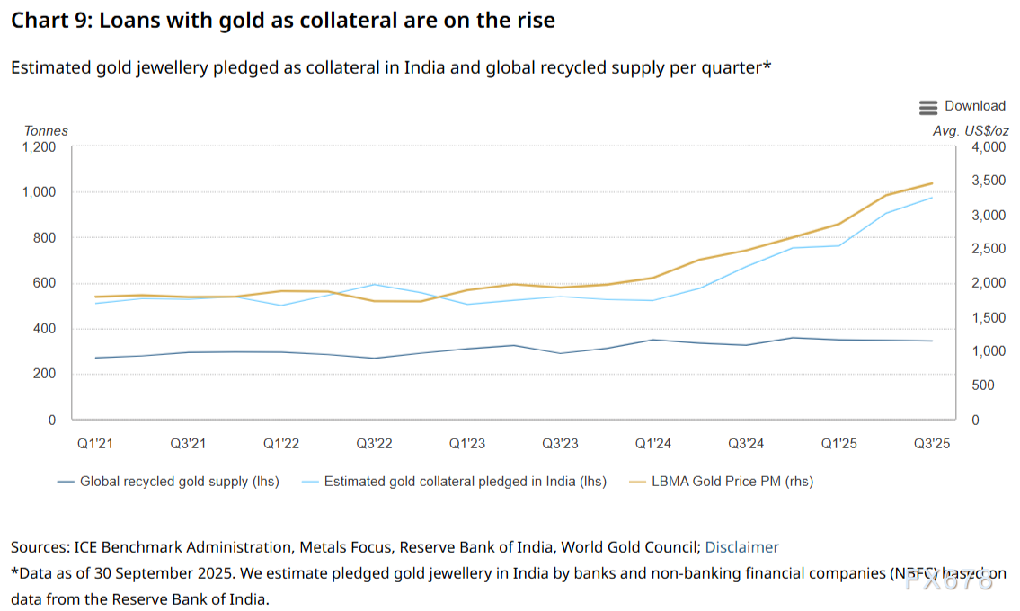回收金流也可能成为影响黄金价格方向的重要摇摆因素。分析师表示:“在计入金价上涨及经济增长影响等因素后,今年黄金回收量相对低迷。这一现象与黄金作为贷款抵押品的使用显著增加有关。仅今年一年,印度消费者通过正规渠道抵押的黄金首饰就超过200吨。非正式证据表明,非正规部门的黄金抵押贷款规模也几乎相当。”