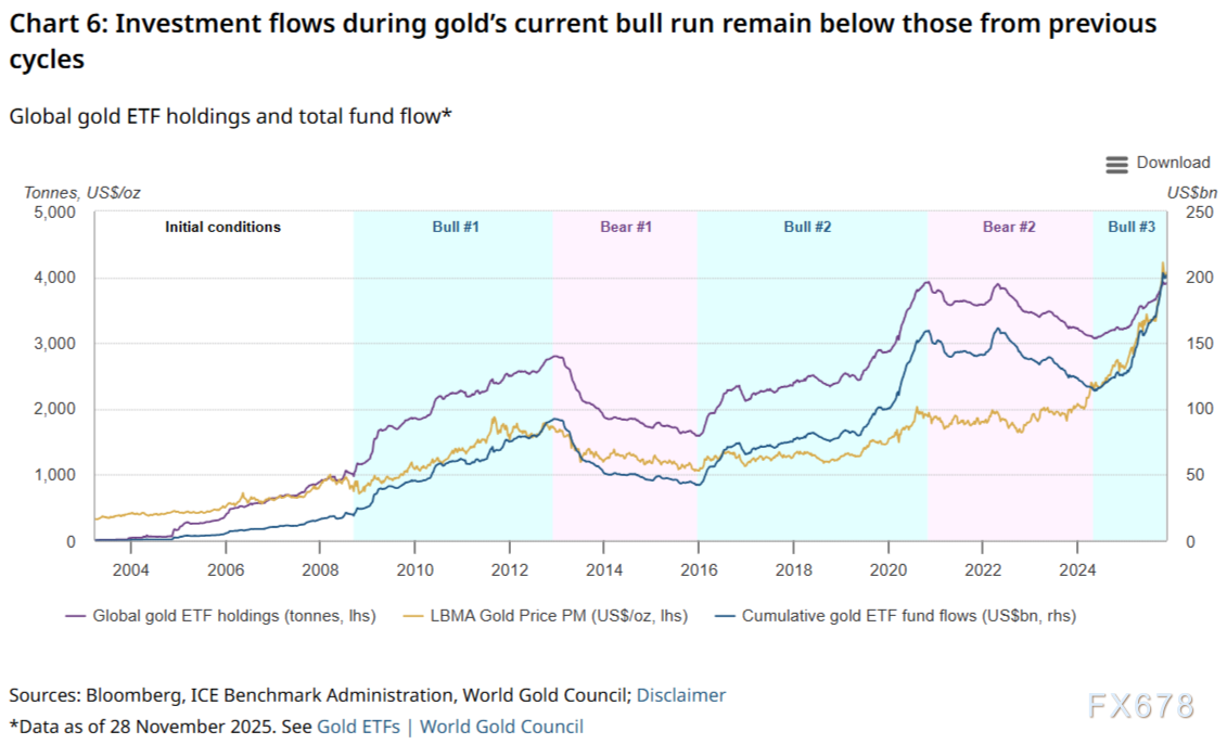世界黄金协会称,黄金ETF的投资需求仍将是关键驱动力,很可能抵消珠宝或科技领域可能出现的疲软。他们指出:“历史表明,价格上涨往往会激发投资者兴趣,加速动量形成。今年以来全球黄金ETF已录得770亿美元资金流入,持仓量增加逾700吨。即使我们将观察起点进一步回溯至2024年5月,全球黄金ETF总持仓量仍增长约850吨。这一数字尚不及此前黄金牛市周期所见规模的一半,表明仍有充足的增持空间。”