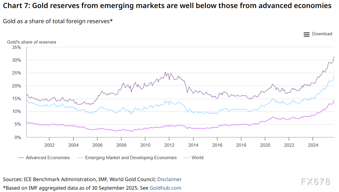 分析师指出:“新兴市场国家的黄金储备(这是需求的主要来源)仍远低于发达国家水平。如果地缘政治紧张局势升级,新兴市场的购金步伐可能加快,从而强化对黄金的结构性支撑。”