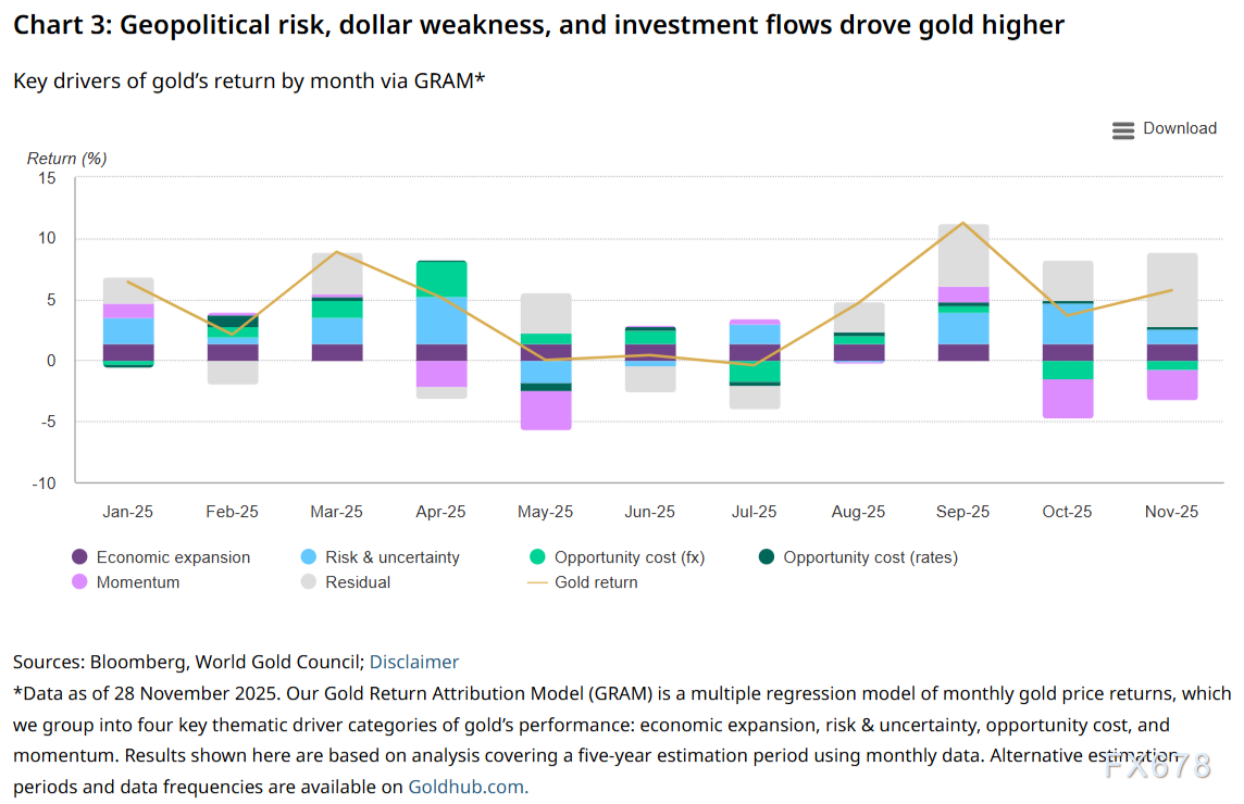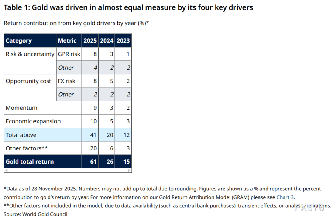世界黄金协会的黄金归因模型显示,高风险环境(主要由地缘政治风险驱动)解释了金价年内涨幅中约12个百分点的来源,而美元走弱和利率小幅下降带来的机会成本降低则贡献了另外10个百分点。
