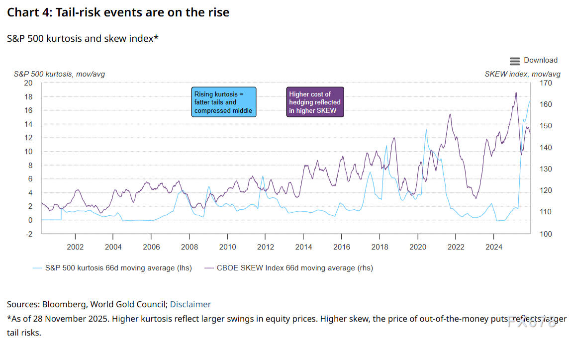协会补充道:“市场对美国劳动力市场疲软的担忧日益加剧,同时关于通胀将持续顽固高位还是面临新上行压力的争论依然存在。与此同时,尽管取得了一些进展,地缘政治摩擦仍在持续发酵。这对黄金意味着什么?与今年情况相似,诸如解放日之类的不可预见事件仍无法预判。不过,虽然这些事件的具体性质难以预测,但尾部风险事件的发生频率正在上升。”