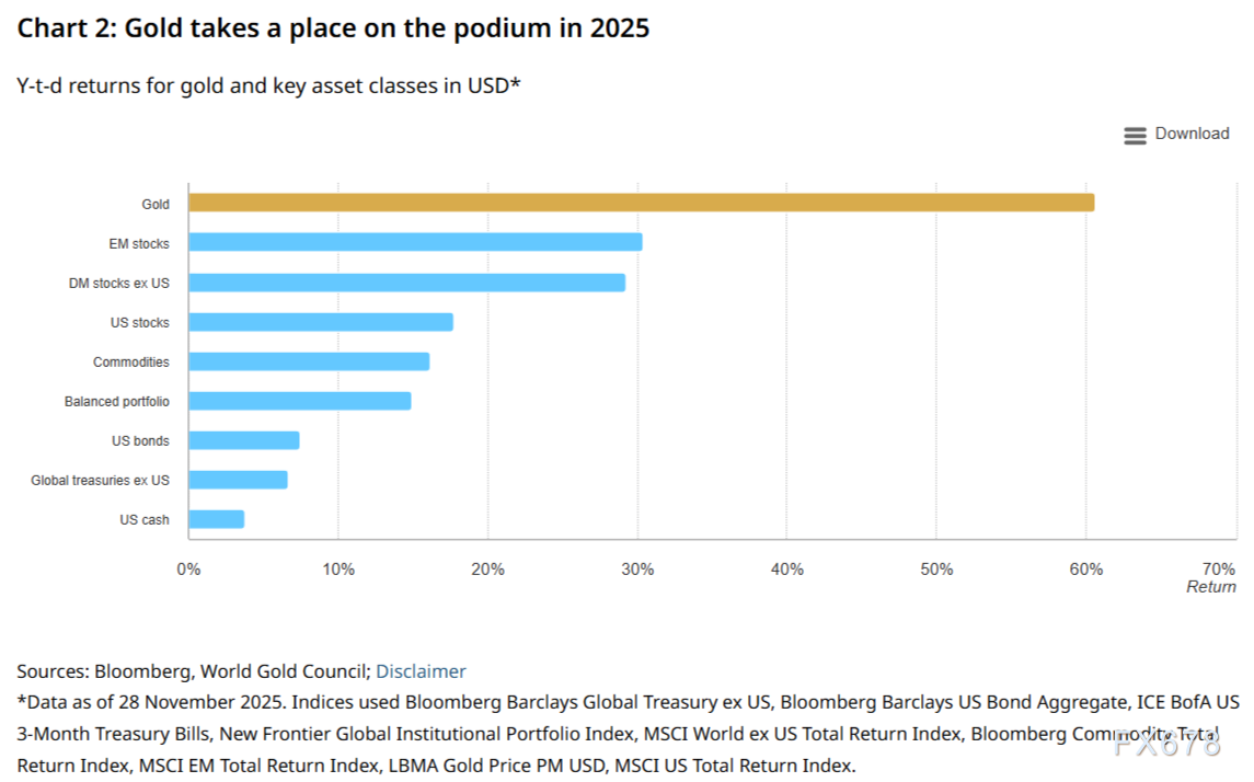 世界黄金协会分析师在《2026年黄金展望》报告中指出,2025年黄金表现亮眼,创下50多次历史新高,涨幅超过60%。他们表示:“地缘政治和经济不确定性加剧、美元走弱以及积极的价格势头共同支撑了这一表现。投资者和央行都增加了黄金配置,以寻求多元化和稳定性。”