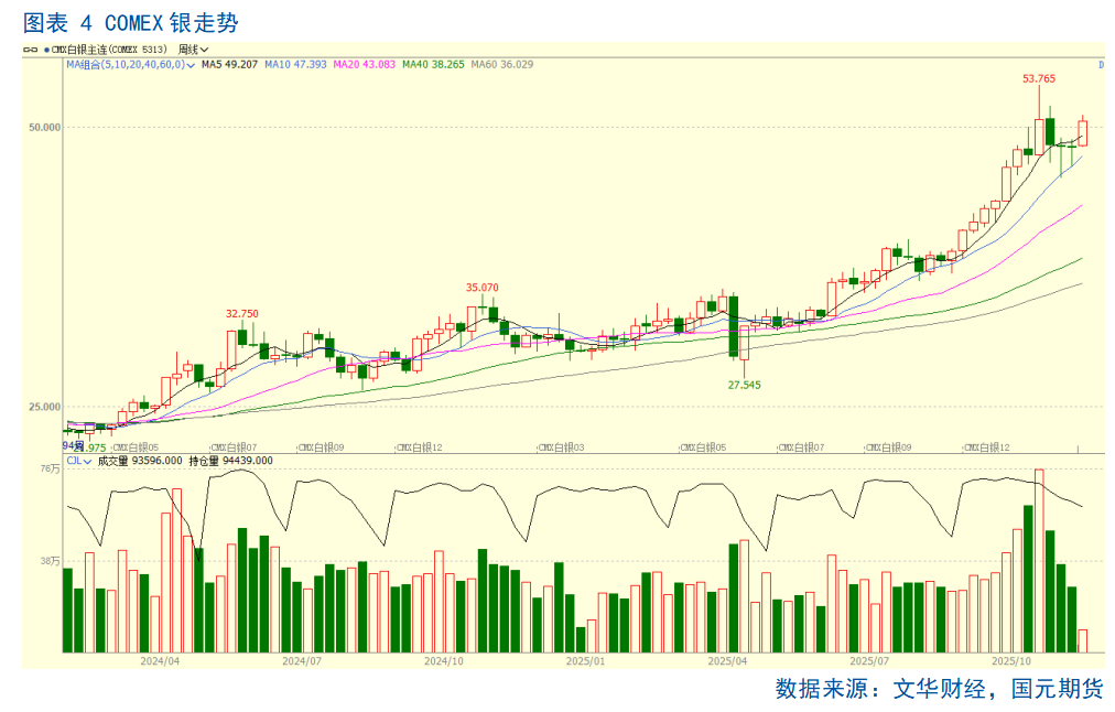 2025年贵金属继续延续强势表现,金银价格协同上涨,持续刷新历史最高价位。但黄金和白银的运行节奏略有差异,上半年贵金属价格上涨主要由黄金引领,但5月起,黄金开始表现出阶段性滞涨,虽然9月再度开启年内第二轮上涨行情,但涨幅较白银偏弱。