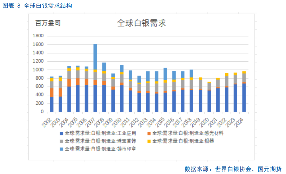 伴随光伏行业的快速发展,太阳能电池板等新兴工业需求快速上升,白银的制造业需求在近几年快速提升。从工业需求结构来看,电力电子和光伏依然是两大最重要的需求部分,且在2024年维持增长态势。焊料需求自2023年起稳中有增,其他工业需求有所下降。摄影用银自2022年以来逐年收缩,白银的珠宝需求虽然在下降过程中有所反复,但难敌珠宝及银器消费下滑的大趋势。白银的实物投资在2022年达到阶段峰值后持续收缩,截至2024年已经回落至200万盎司以下。