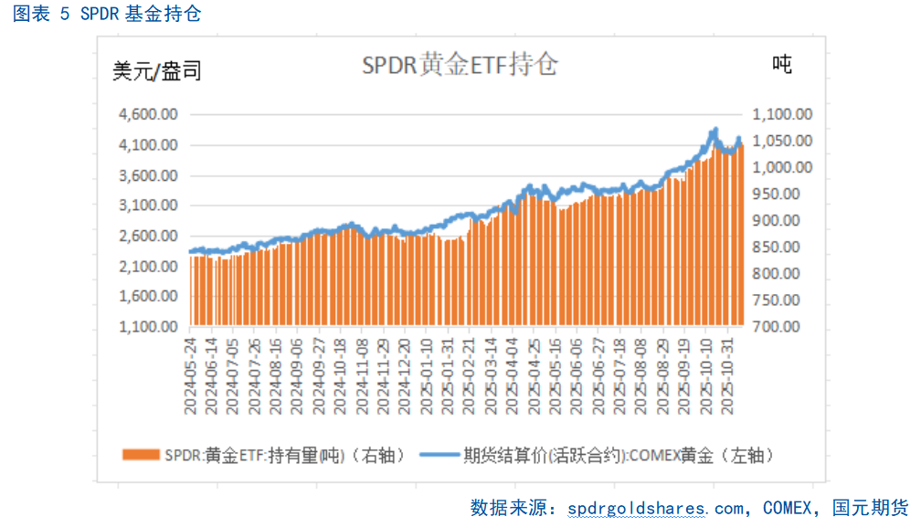 2025年SPDR黄金ETF持仓量稳中有增,整体持仓水平较去年明显增加。年初SPDR黄金ETF持仓量自870吨稳步增加基金持仓在3月中旬成功突破900吨关口。而后,SPDR黄金ETF持仓量多数时候维持在930-950吨水平长达3个月,黄金价格窄幅震荡。7月末开始,基金多头再度发力,市场观点也逐步趋于一致,SPDR黄金ETF持仓量持续增长,并在9月末突破1000吨后继续累积。