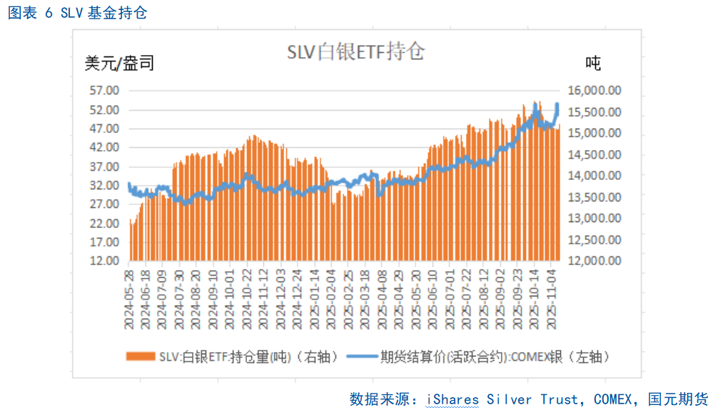 白银的基金持仓数据相对黄金波动更为明显。近年来,SLV白银ETF持仓处于逐年降低态势,2025年明显打破这一节奏。一季度黄金价格上涨对白银带动作用相对有限,SLV白银ETF持仓多数时候维持在1.33-1.44万吨低水平区间,6月SLV基金持仓开始增持白银,9月市场避险需求再度提升时,SLV白银ETF持仓快速加仓至2021年以来的高水平,并带动白银价格走出一轮流畅的上涨行情。
