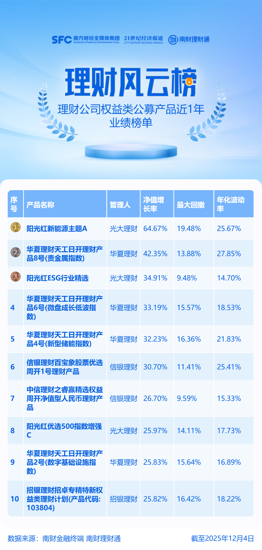 产品统计范围为理财公司权益类理财公募产品,统计截止日期为2025年12月4日,统计区间为近1年。